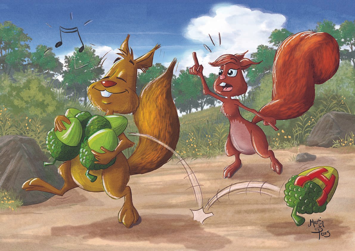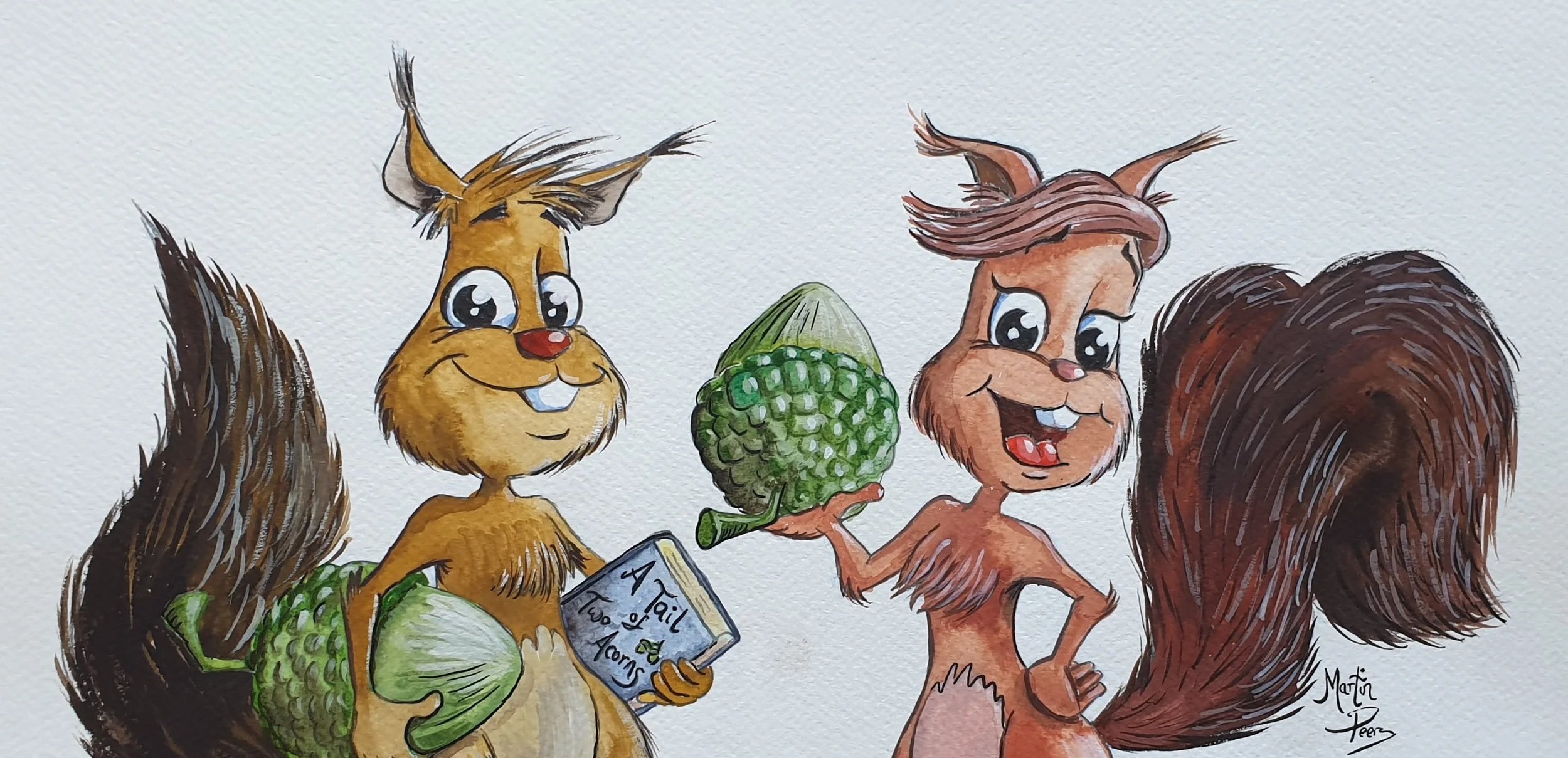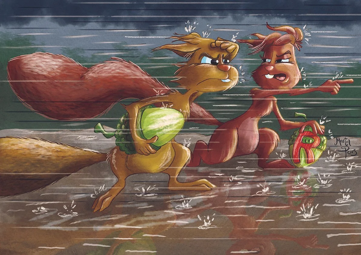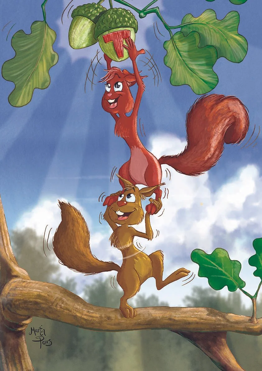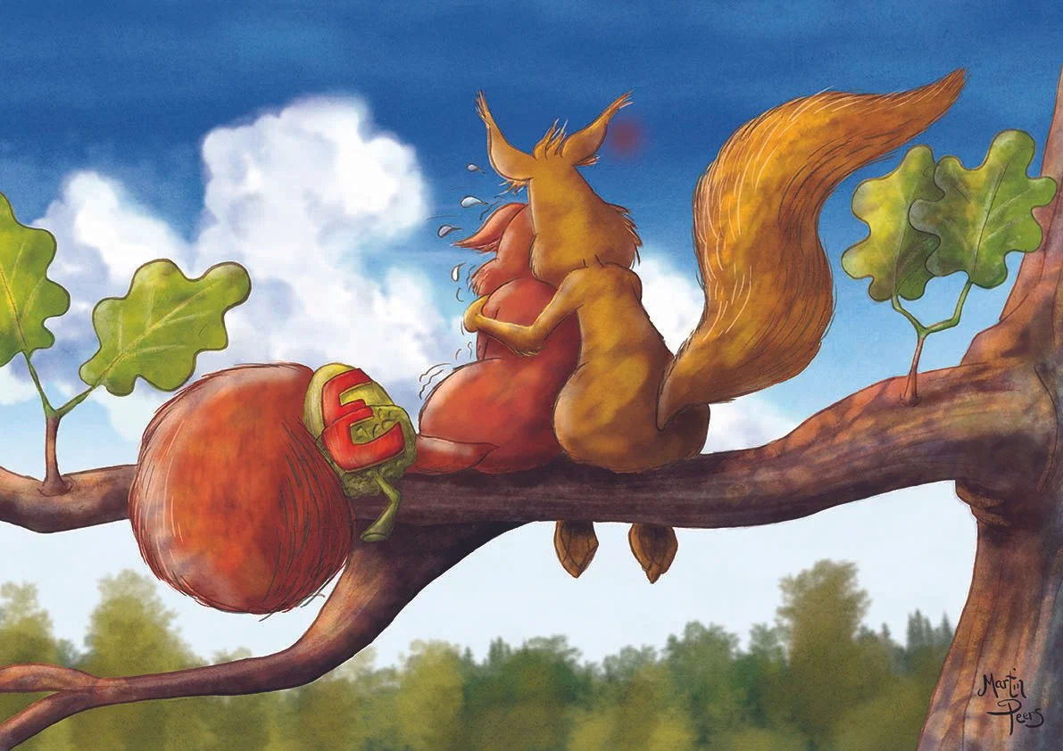 My creative journey to represent these values began with a cast of fun animal characters that best represented these qualities, along with inspirational relevant quotes. In collaboration with the school Principal and through workshops with the children, we eventually came up with the idea of a pair of squirrels. My challenge was to develop these characters and find ways to depict them clearly demonstrating each core value as a single illustration.